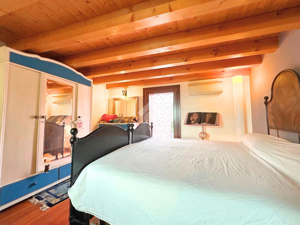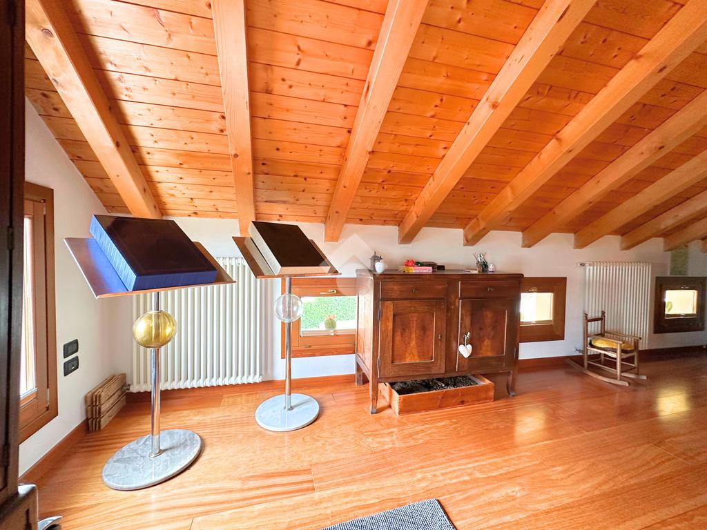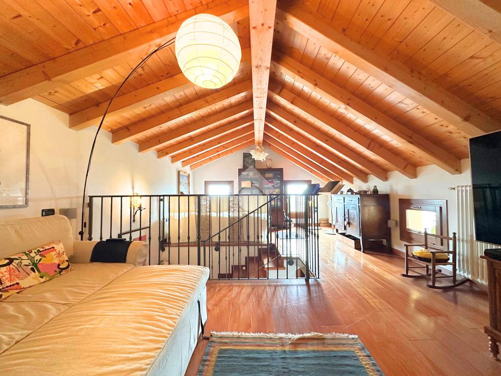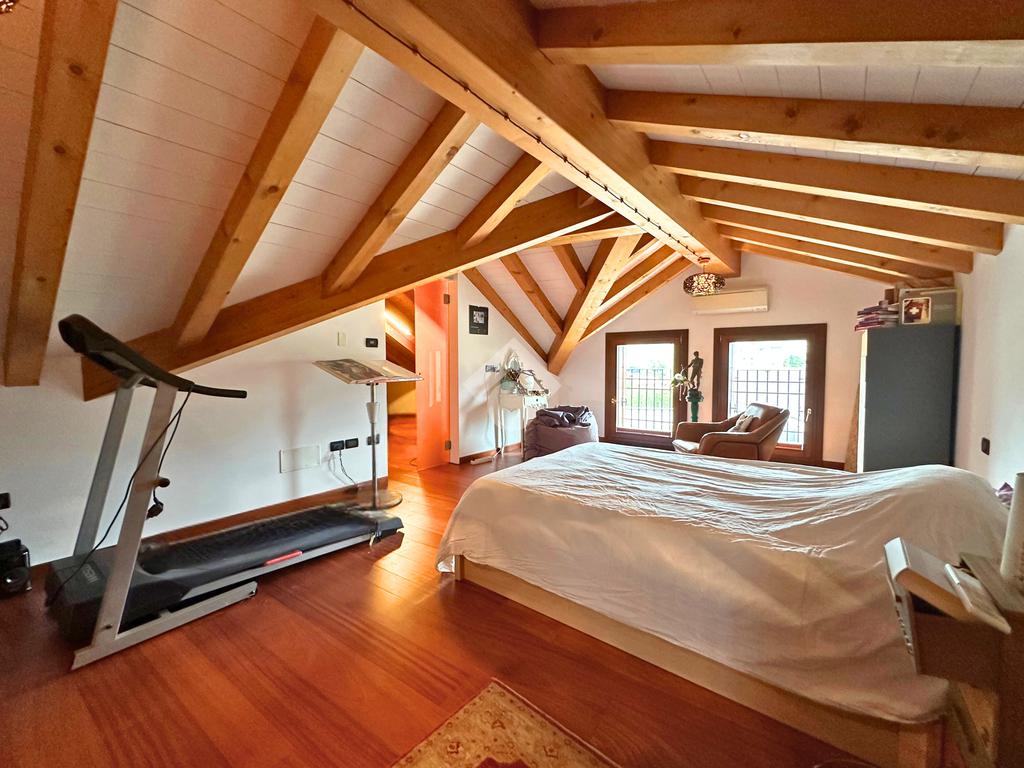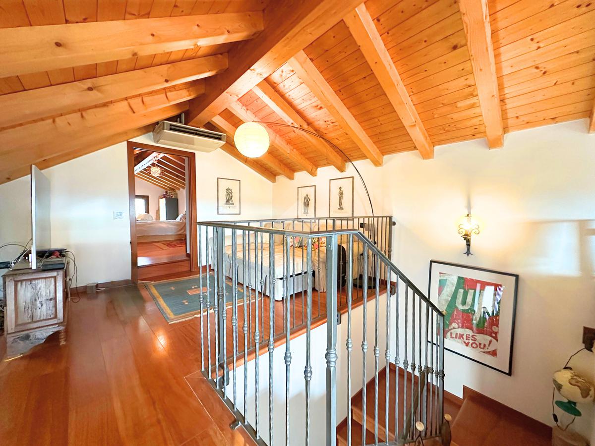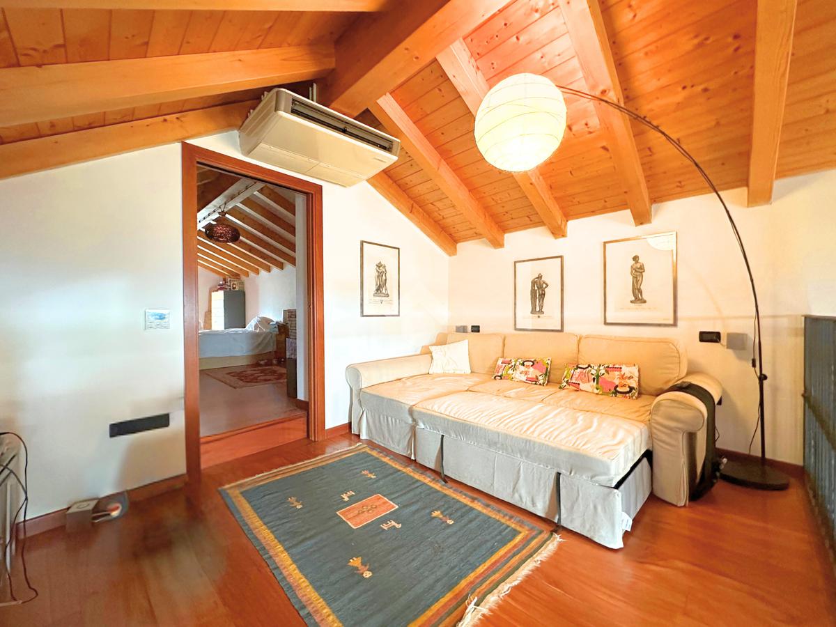 Salendo al piano mansardato si sviluppa un’ulteriore grande camera matrimoniale con cabina armadio e un ampio ambiente dedicato a studio, perfetto come spazio privato o lavorativo.