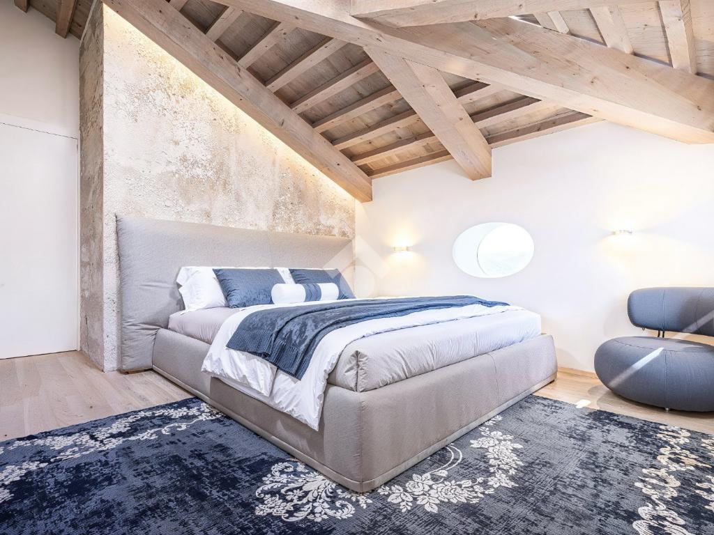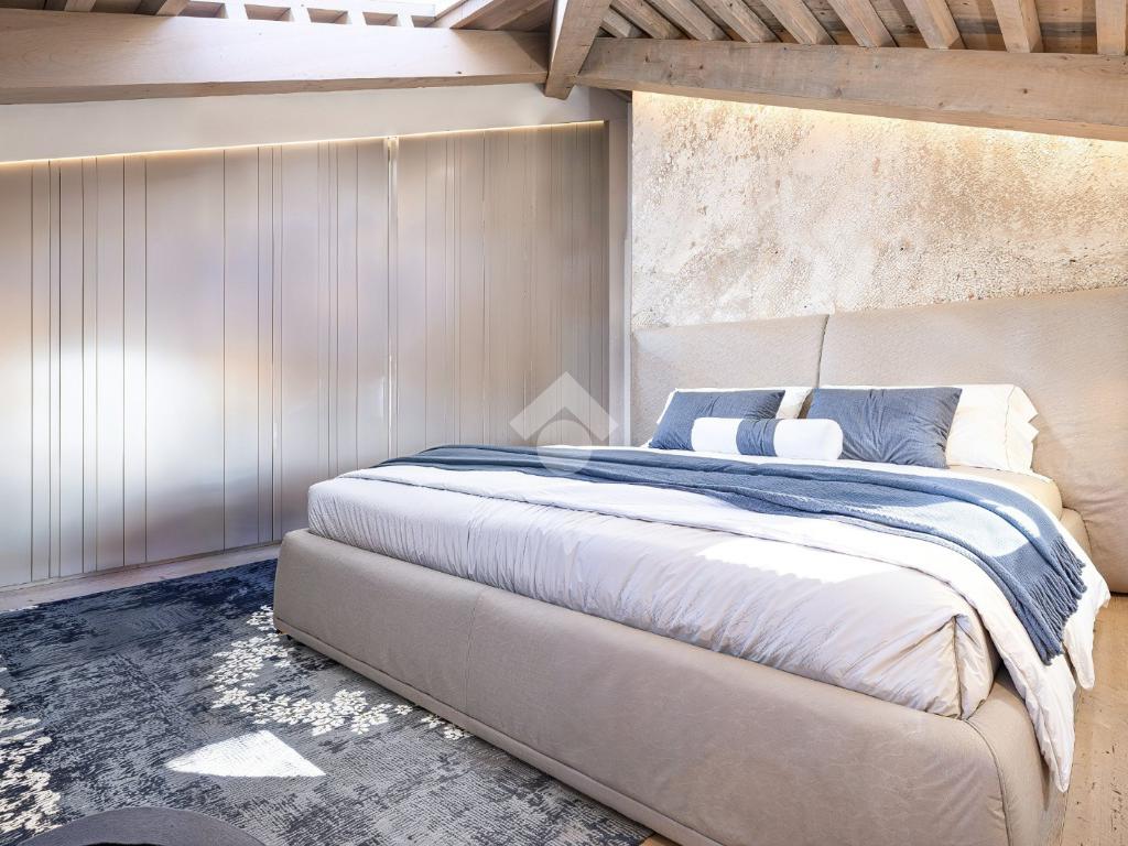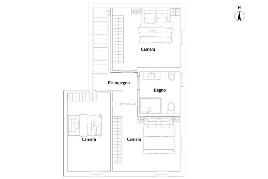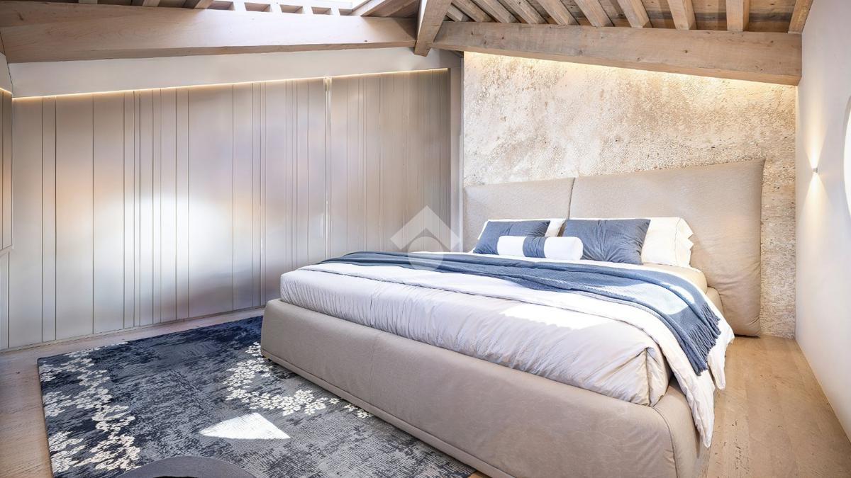Il piano superiore, valorizzato da travi a vista in legno e acciaio, ospita tre camere da letto, due matrimoniali e una doppia/studio – tutte dotate di ottima luminosità grazie a finestre e lucernari.