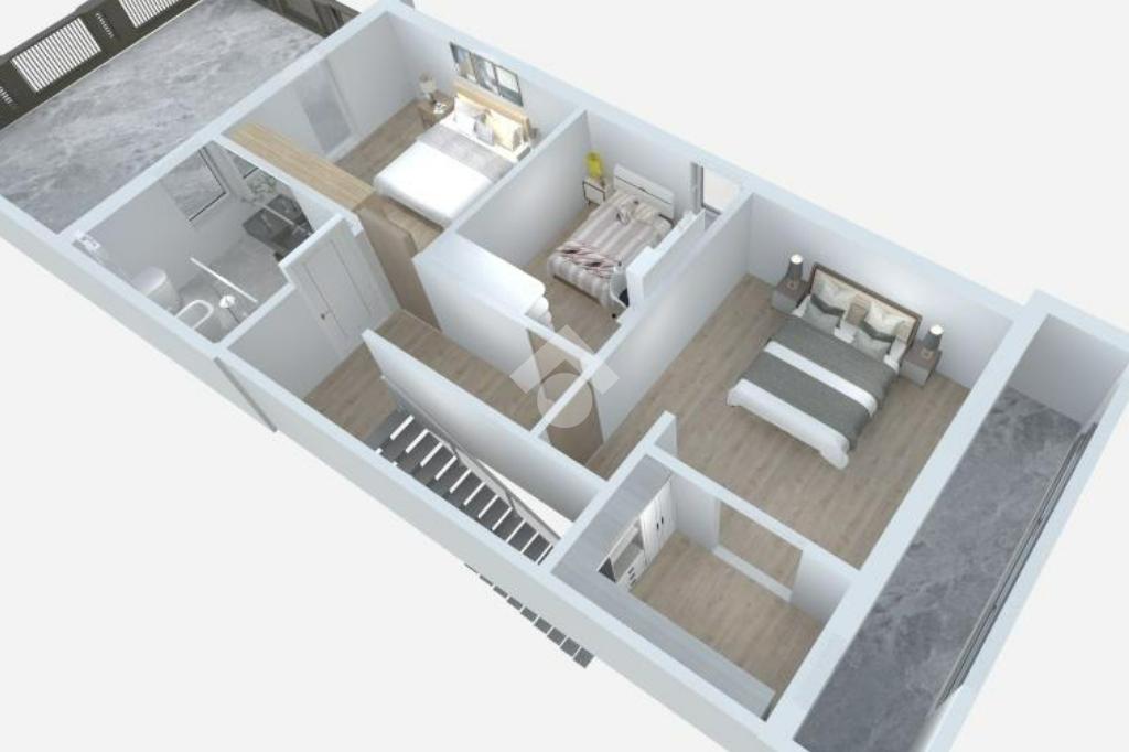 La zona notte al piano superiore accoglie una camera padronale con cabina armadio, una seconda camera matrimoniale con accesso a una splendida terrazza abitabile di 30 mq perfetta per colazioni all’aperto o serate in compagnia, una terza camera ideale come stanza singola o studio e un elegante bagno finestrato con doccia.