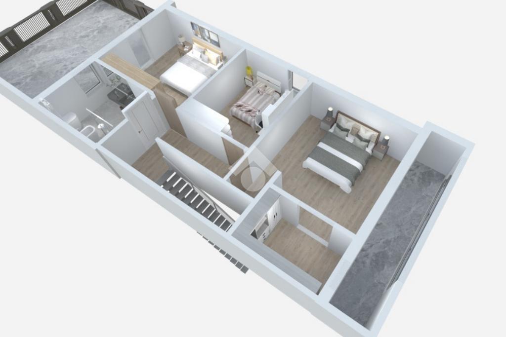 La zona notte al piano superiore accoglie una camera padronale con cabina armadio, una seconda camera matrimoniale con accesso a una splendida terrazza abitabile di 30 mq perfetta per colazioni all’aperto o serate in compagnia, una terza camera ideale come stanza singola o studio e un elegante bagno finestrato con doccia.
